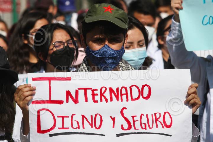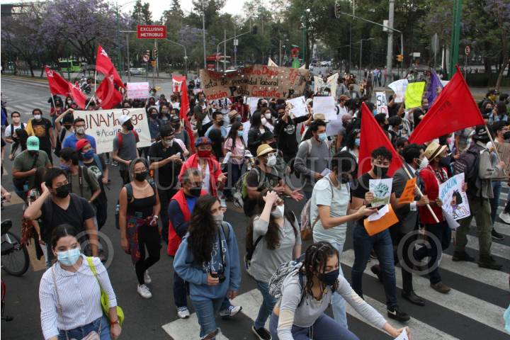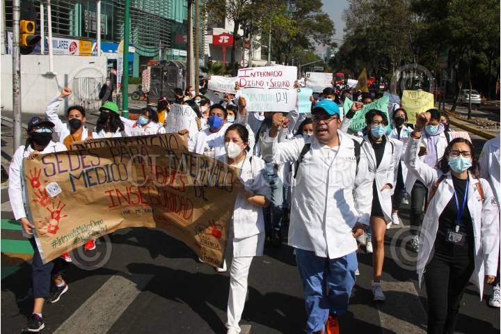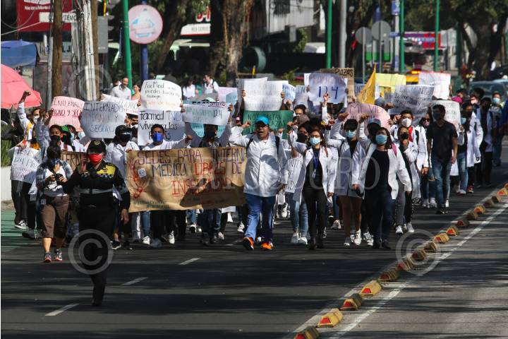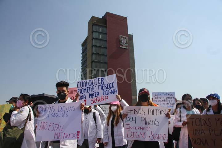 Alumnos de medicina de la UNAM marcharon del Parque la Bombilla a la Rectoría de Ciudad Universitaria para exigir plazas laborales y diálogo con el rector.