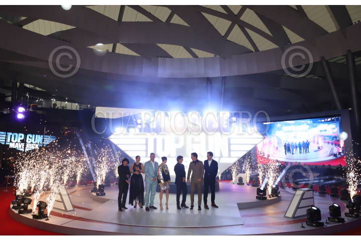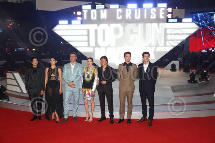 Parte del elenco que encabeza la película “Top Gun Maverick” durante la alfombra roja por su estreno en Parque Toreo.