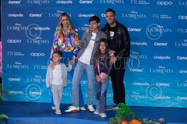 Odalys Ramírez y Patricio Borghetty junto a sus hijos Gía Rocco y Santino a su paso por la alfombra azul por el estreno de la nueva película live action de Disney “La Sirenita”, próxima a estrenarse en salas de cine.