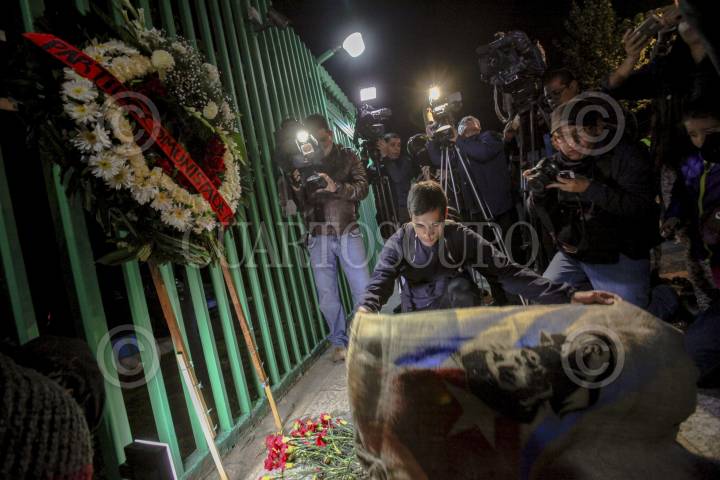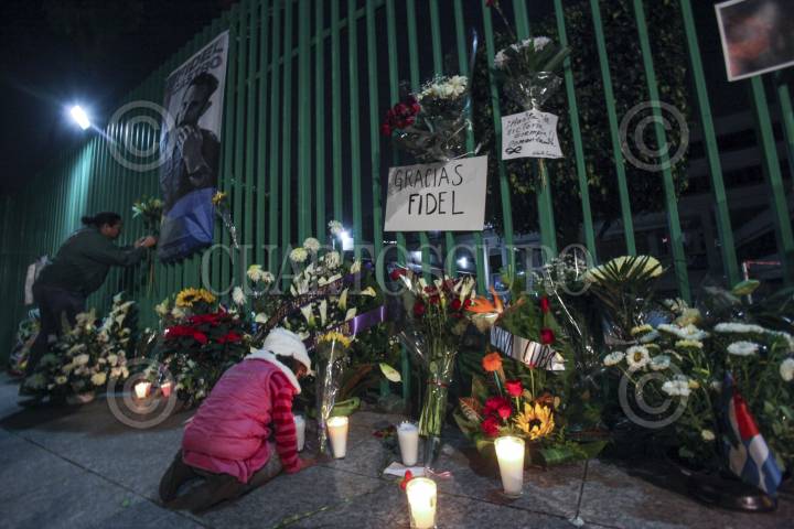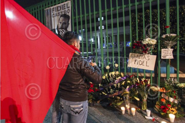CIUDAD DE MÉXICO, 26 NOVIEMBRE 2016.- Integrantes del Partido Comunista de México rindieron homenaje a Fidel Castro afuera de la Embajada de Cuba. Alrededor de 60 personas cantaron canciones y leyeron comunicados a manera de despedida al líder de la Revolución cubana FOTO: JUAN PABLO ZAMORA /CUARTOSCURO.COM