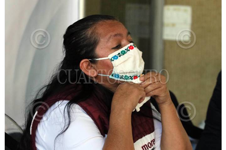 Edi Margarita Soriano, enlace del CEN de MORENA en Morelos se limpia el sudor con una servilleta durante la conferencia para presentar la coalición electoral Juntos Haremos Historia en Morelos.