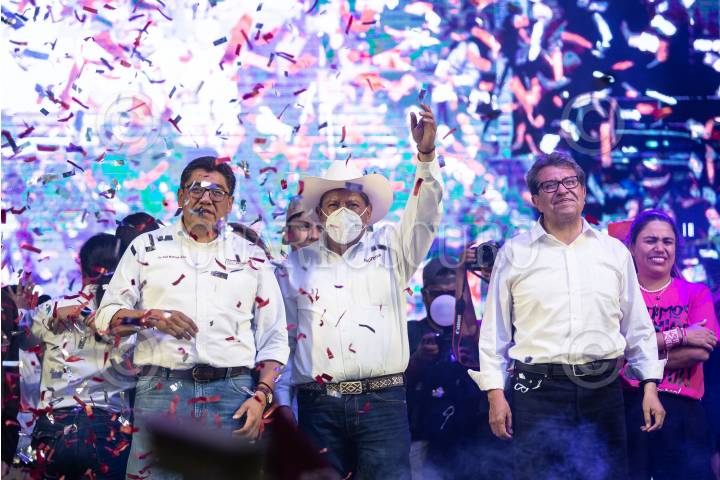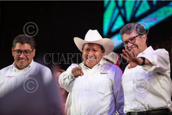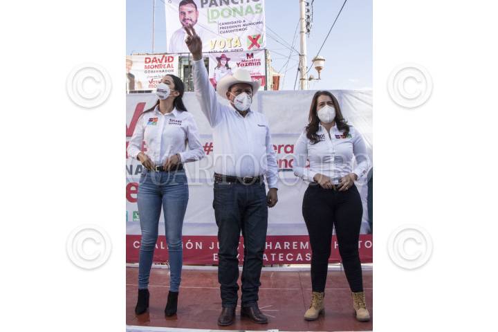 Saúl Monreal, candidato a la presidencia de Fresnillo; David Monreal, candidato a la gubernatura y Ricardo Monreal, senador presidente de la Junta de Coordinación Política, durante un mitin en el municipio.