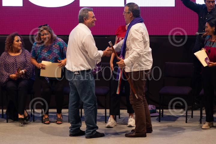 Marcelo Ebrard, quien busca encabezar la candidatura presidencial de Morena, saluda a Pío López Obrador, durante su evento en San Cristóbal de las Casas.