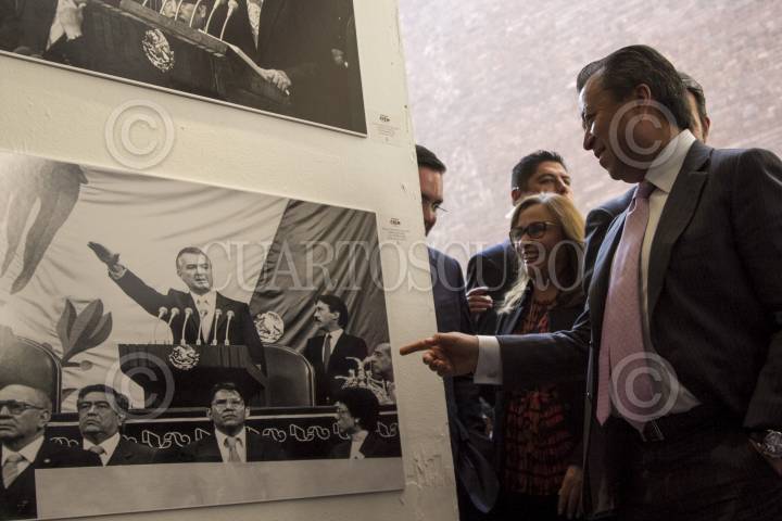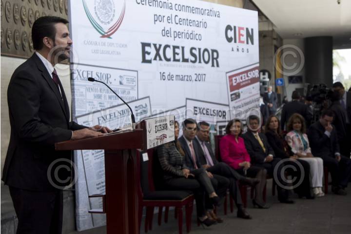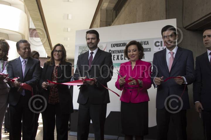 CIUDAD DE MÉXICO, 16MARZO2017.- César Camacho Quirzo, coordinador del Grupo Parlamentario del PRI; Pascal Beltrán del Río, director editorial del periódico Excélsior; María Guadalupe Murguía, presidenta de la Mesa Directiva de la Cámara de Diputados, y Jesús Sesma Súarez, coordinado del Grupo Parlamentario del PVEM, durante la inauguración de la exposición por el centenario del periódico, en el pasillo H del Palacio Legislativo de San Lázaro. FOTO: GALO CAÑAS /CUARTOSCURO.COM