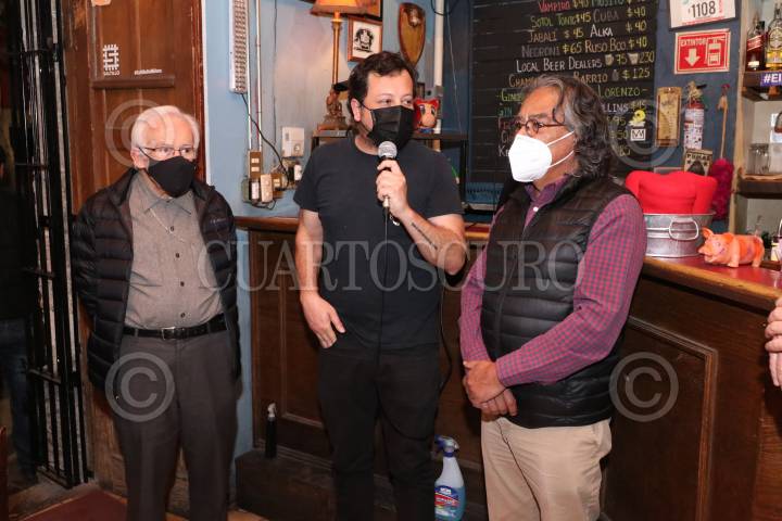 Raúl Vera, obispo emérito, acompañó y brindó con Pedro Valtierra, director de la Agencia y Revista Cuartoscuro, durante la inauguración de la exposición "Pasión por lo cotidiano", en la Taberna Cerdo de Babel.