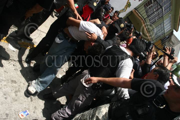 ECATEPEC, ESTADO DE MÉXICO, 05JULIO2009.- Mas de 5 lesionados fue el saldo de un enfrentamiento, entre policías federales y ministeriales a las afueras de la Unión de Vendedores Ambulantes Vagoneros, Pasilleros 17 de Julio, ubicado en la calle Citlaltepec en Ciudad Azteca. La balacera inicio cuando los agentes federales realizaron un operativo en dicho inmueble por que les habían reportado irregularidades electorales y la agresión a Juan Carpinteiro, candidato panista suplente. Más de un centenar de policías federales acudieron al lugar y fueron remitidos más de 50 personas, entre ellos niños y personas de la tercera edad. FOTO: SAÚL LÓPEZ/CUARTOSCURO.COM