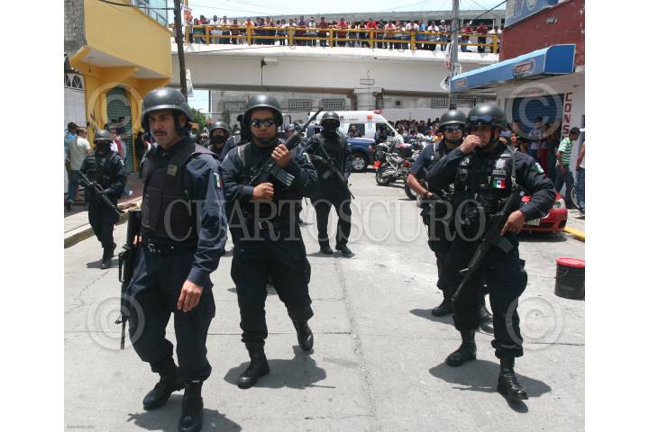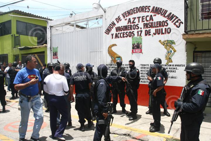 ECATEPEC, ESTADO DE MÉXICO, 05JULIO2009.- Mas de 5 lesionados fue el saldo de un enfrentamiento, entre policías federales y ministeriales a las afueras de la Unión de Vendedores Ambulantes Vagoneros, Pasilleros 17 de Julio, ubicado en la calle Citlaltepec en Ciudad Azteca. La balacera inicio cuando los agentes federales realizaron un operativo en dicho inmueble por que les habían reportado irregularidades electorales y la agresión a Juan Carpinteiro, candidato panista suplente. Más de un centenar de policías federales acudieron al lugar y fueron remitidos más de 50 personas, entre ellos niños y personas de la tercera edad. FOTO: LEONARDO CASAS/CUARTOSCURO.COM