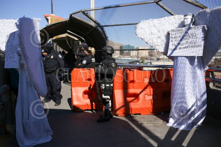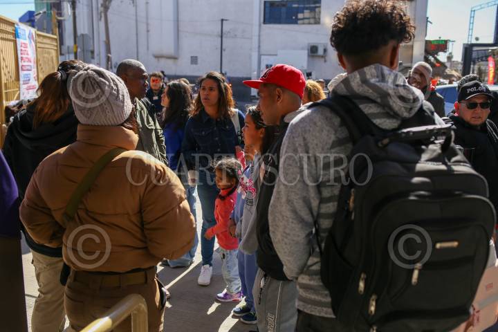 CIUDAD JUÁREZ, CHIHUAHUA, 21ENERO2025.- Personas migrantes de distintas nacionalidades que tenían cita para el permiso humanitario mediante CBP One acudieron al Puente Internacional Paso del Norte pese a la cancelación anunciada ayer por Donald Trump, presidente de los Estados Unidos. Las personas fueron atendidas por personal del Fideicomiso de Puentes Fronterizos de Chihuahua quienes le brindaron información y atención, mientras en el acceso principal se mantuvo presencia de la Guardia Nacional y del Instituto Nacional de Migración (INM). FOTO: MARIO JASSO/CUARTOSCURO.COM