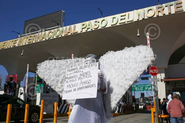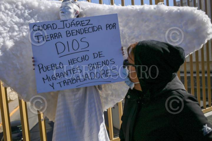 CIUDAD JUÁREZ, CHIHUAHUA, 23ENERO2025.- El colectivo Ángeles Mensajeros se reunió en el puente internacional Santa Fe para brindar apoyo a los migrantes que quedaron varados tras la cancelación de sus citas migratorias en Estados Unidos. Vestidos como ángeles y portando mensajes de esperanza, los integrantes ofrecieron café y comida a las personas deportadas mientras pedían al gobierno mexicano permisos laborales temporales para quienes permanecen en territorio nacional. “Ciudad Juárez es una tierra de oportunidades para quienes buscan salir adelante”, declaró Carlos Mayorga, líder del grupo.. FOTO: CARLOS SÁNCHEZ COLUNGA/CUARTOSCURO.COM