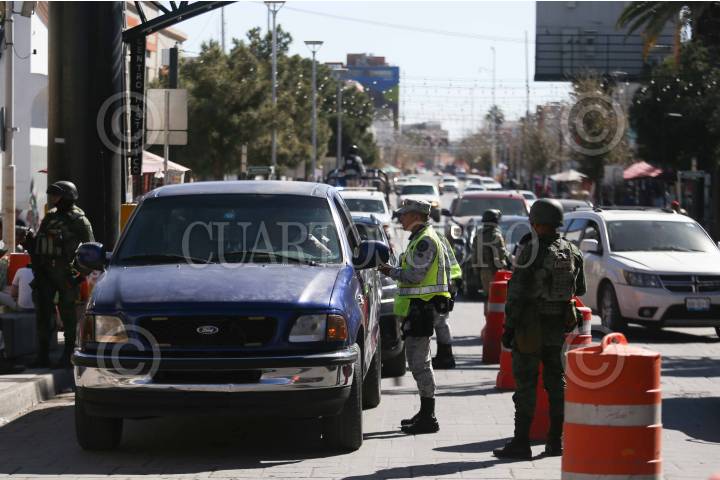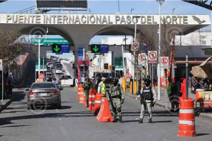CIUDAD JUÁREZ, CHIHUAHUA, 07FEBRERO2025.- Autoridades mexicanas desplegaron operativos de seguridad en los cruces internacionales de Ciudad Juárez, donde la Guardia Nacional y el Ejército realizan inspecciones a vehículos y pasajeros. La medida, ordenada por la presidenta Claudia Sheinbaum, busca reforzar la seguridad, el control migratorio y la lucha contra el tráfico de drogas en la frontera con EE.UU. FOTO: CARLOS SÁNCHEZ COLUNGA/CUARTOSCURO.COM