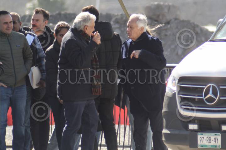 SAN JUAN DE SABINAS, COAHUILA, 19ENERO2024.- Andrés Manuel López Obrador, presidente de México, y Manuel Bartlett , director general de CFE, durante su visita a la mina Pasta de Conchos para supervisar el rescate de los cuerpos de los 63 mineros, quienes quedaron atrapados tras un derrumbe en 2006. FOTO: CUARTOSCURO.COM