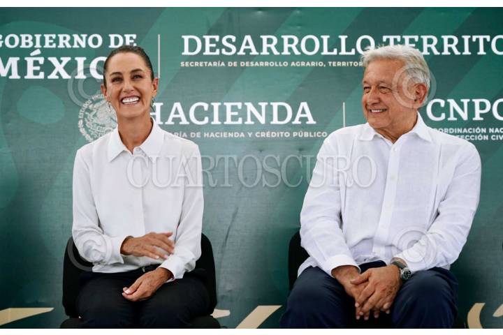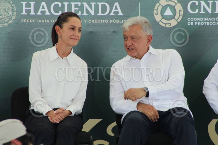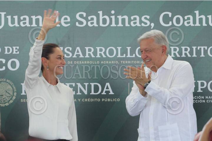 SAN JUAN DE SABINAS, COAHUILA, 14JUNIO2024.- Andrés Manuel López Obrador, presidente de México y Claudia Sheinbaum, virtual presidenta electa, durante la presentación del “Plan de Justicia para Pasta de Conchos”. FOTO: PRESIDENCIA/CUARTOSCURO.COM