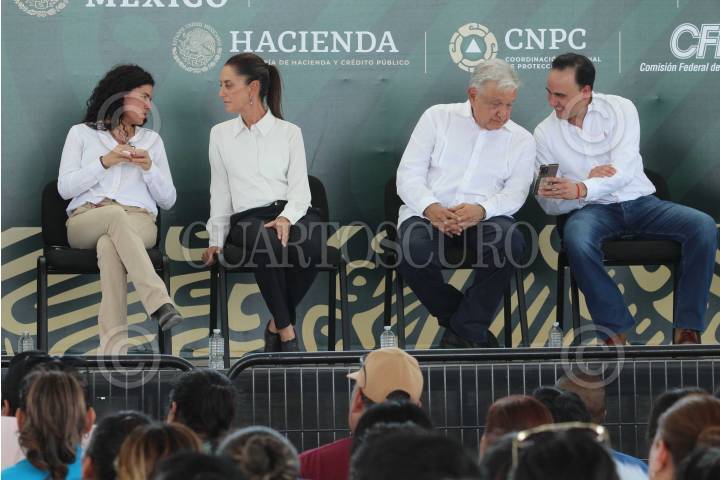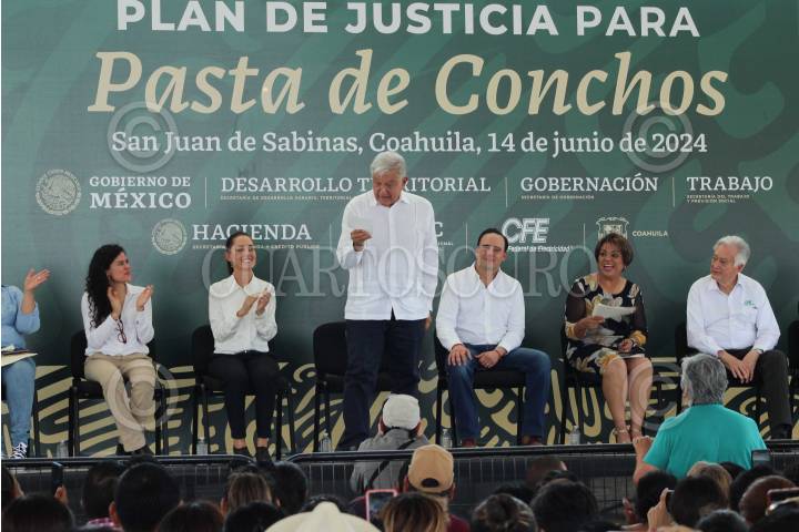 SAN JUAN DE SABINAS, COAHUILA, 14JUNIO2024.- Andrés Manuel López Obrador, presidente de México, acompañado de la presidenta electa de México, Claudia Sheinbaum, Manolo Jiménez Salinas, gobernador de Coahuila, y Luisa María Alcalde, secretaria de Gobernación, presidieron el Plan de Justicia para Pasta de Conchos. FOTO: MANUEL RODRÍGUEZ MURO/CUARTOSCURO.COM