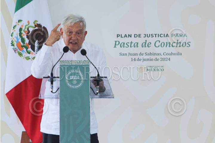 SAN JUAN DE SABINAS, COAHUILA, 14JUNIO2024.- Andrés Manuel López Obrador, presidente de México, durante su discurso en la presentación del Plan de Justicia para Pasta de Conchos, en el que dijo a las viudas y deudos de los 65 mineros que perdieron la vida en la mina 8 de Pasta de Conchos, que el rescate de los 63 mineros que continúan atrapados en el fondo de la mina, se realice antes de terminar su mandato. FOTO: MANUEL RODRÍGUEZ MURO/CUARTOSCURO.COM
