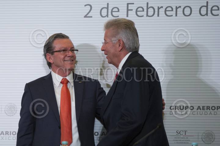 CIUDAD MÉXICO, 02FEBRERO2017.- Gustavo Arballo Luján, presidente de la Cámara Mexicana de la Industria de la Construcción, saludó a Gerardo Ruiz Esparza, secretario de Comunicaciones y Transportes, durante la presentación de las licitaciones 2017 para el Nuevo Aeropuerto de la Ciudad de México. FOTO: GALO CAÑAS /CUARTOSCURO.COM