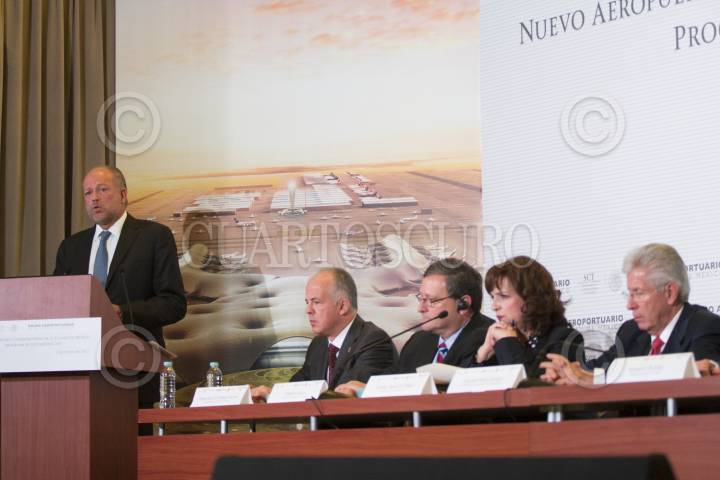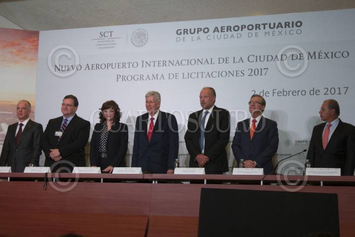CIUDAD MÉXICO, 02FEBRERO2017.- Fernando Gutiérrez Rocha, presidente del Colegio de Ingenieros; Perfecto Solis, presidente de Aviación de Parsons; Yuriria Mascott Pérez, subsecretaria de Transporte; Gerardo Ruiz Esparza, secretario de Comunicaciones; Federico Patiño, director general del GACM; Gustavo Arballo Luján, presidente de la Cámara Mexicana de la Industria de la Construcción, y Rodolfo González Fernández, director general de Comunicación Social, durante la presentación de las licitaciones 2017 para el Nuevo Aeropuerto de la Ciudad de México. FOTO: GALO CAÑAS /CUARTOSCURO.COM