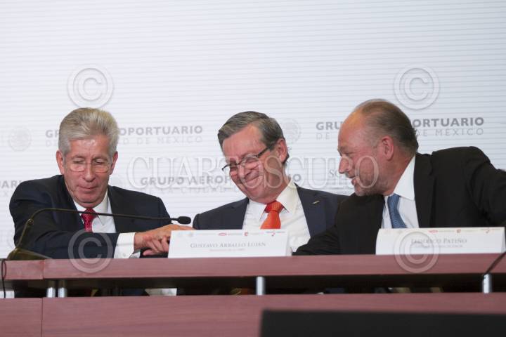 CIUDAD MÉXICO, 02FEBRERO2017.- Gerardo Ruiz Esparza, secretario de Comunicaciones y Transportes; Gustavo Arballo Luján, presidente de la Cámara Mexicana de la Industria de la Construcción, Y Federico Patiño, director general del GACM, durante la presentación de las licitaciones 2017 para el Nuevo Aeropuerto de la Ciudad de México. FOTO: GALO CAÑAS /CUARTOSCURO.COM