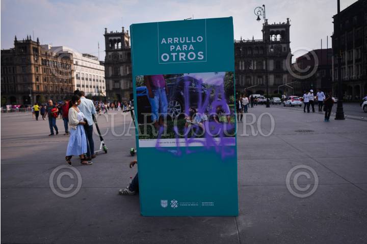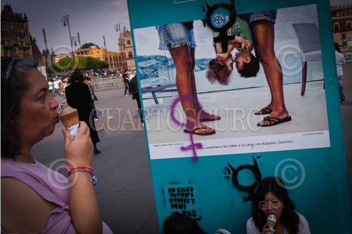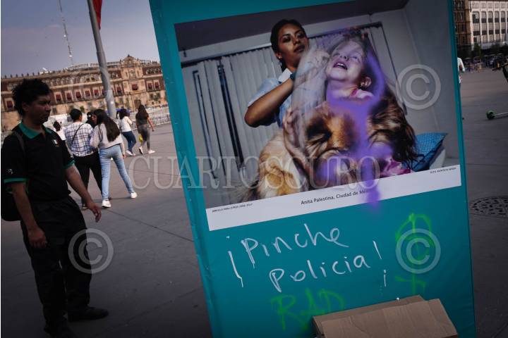 CIUDAD DE MÉXICO 09MARZO2019.- La exposición "Arrullo para otros", de la fotógrafa michoacana, Patricia Aridjis, la cual está montada en la plancha del Zócalo, fue graffiteada el día de ayer durante la marcha por el día de la mujer. FOTO: PEDRO ANZA /CUARTOSCURO.COM