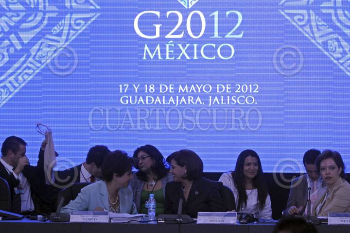GUADALAJARA, JALISCO 17MAYO2012.- En el Hospicio Cabañas de esta ciudad se lleva a cabo la Reunión de Ministros de Trabajo y Empleo del Grupo de los 20, evento al cual acuden titulares y representantes de los ministerios de Trabajo y Empleo de los Miembros del G20, (Alemania, Arabia Saudita, Argentina, Australia, Brasil, Canadá, China, Corea del Sur, Estados Unidos, India, Francia, Indonesia, Italia, Japón, México, Reino Unido, Rusia, Sudáfrica, Turquía y La Unión Europea, así como otros cinco países invitados, (España-Invitado permanente al G20-Colombia, Chile, Camboya y Benín). También está presente la Secretaria del Trabajo y Previsión Social, Rosalinda Vélez Juárez. En la foto platica con la titular de Relaciones Exteriores, Patricia Espinosa. FOTO: FERNANDO CARRANZA /CUARTOSCURO.COM
