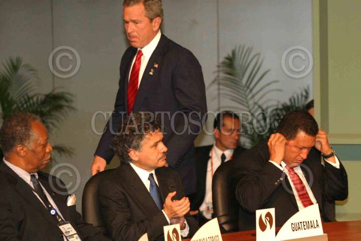 Monterrey, Nuevo León 12ENE2004.- El Presidente de EU George Bush se dirige al podium para hablar ante los mandatarios del Continente, Patrick Manniing de Trinidad y Tobago, Alfonso Portillo de Guatemala, Hugo Chávez de Venezuela. FOTO: Pedro Valtierra/CUARTOSCURO.COM