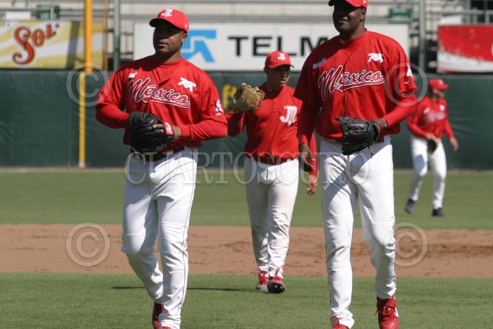 México, D.F. 17 Febrero 2004.- Los pichers Patrick Broswell y Ben Rivera de Los Diablos del México durante el entremaniento de los diablos en el foro sol. FOTO: Nelly Salas/CUARTOSCURO.COM