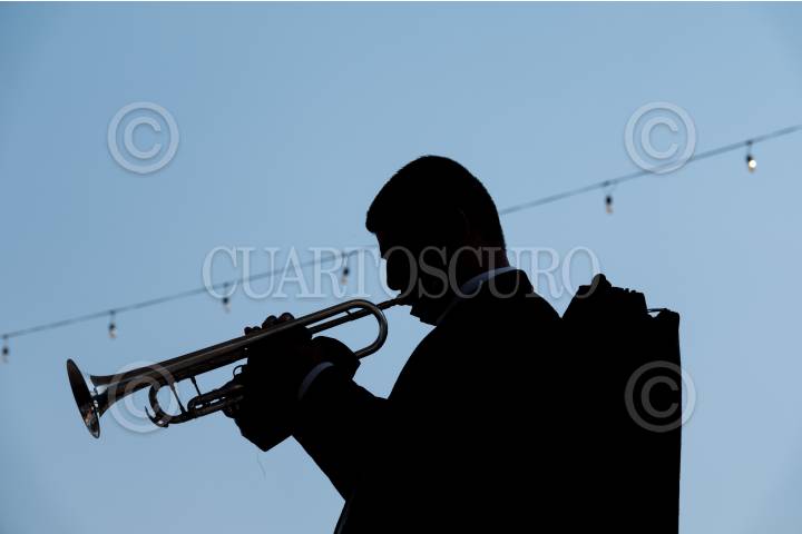 Un hombre que pertenece a una agrupación de Mariachi practica algunas notas mientras espera clientes para ofrecer sus servicios, esto en la Plaza de los Mariachis de Guadalajara.