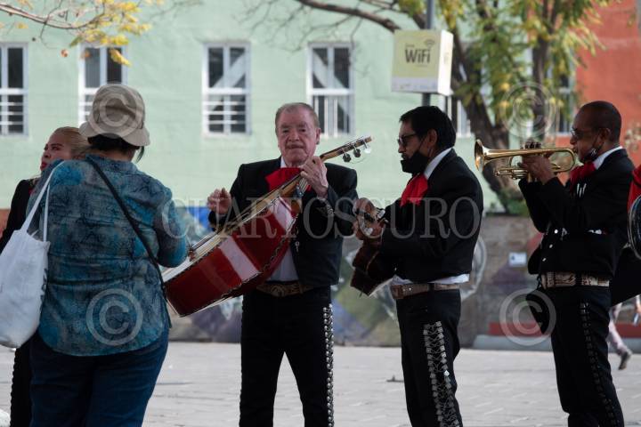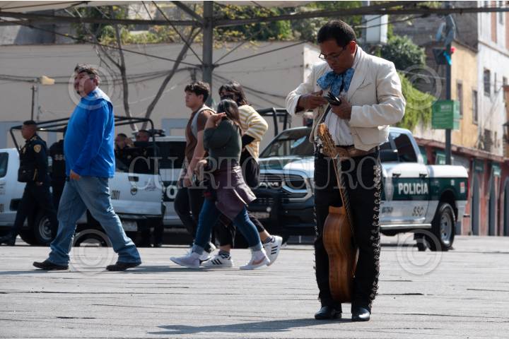 Un hombre que pertenece a una agrupación de Mariachi espera clientes para ofrecer sus servicios, esto en la Plaza de los Mariachis de Guadalajara.