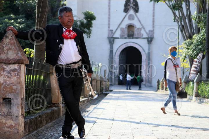 Un trompetista de una mariachi, espera que inicie la misa en honor de Santa Cecilia, patrona de los musicos, en la catedral de la capital de Morelos.