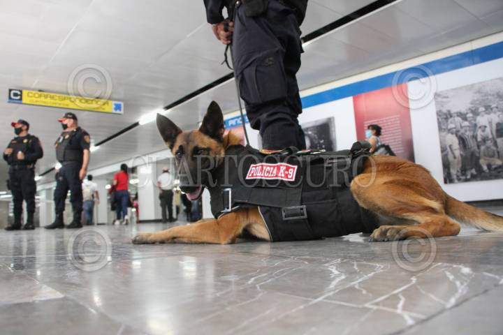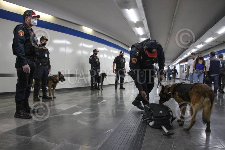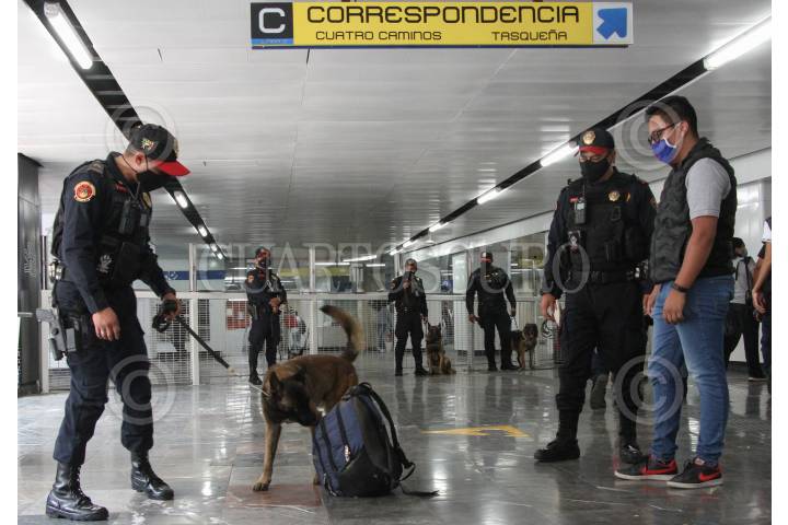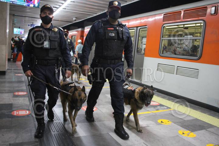 Policías capitalinos en conjunto con elementos binomios caninos, realizan vigilancia en la línea 2 del metro.