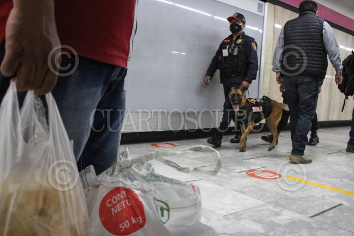 Policías capitalinos en conjunto con elementos binomios caninos, durante la revisión de una mochila en la estación Pino Suárez de la línea 2 del metro.