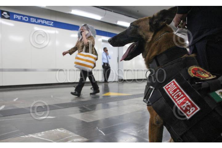Recorrido de seguridad por andenes de la estación Pino Suárez de la línea 1 del metro por policías capitalinos en conjunto con elementos binomios caninos.