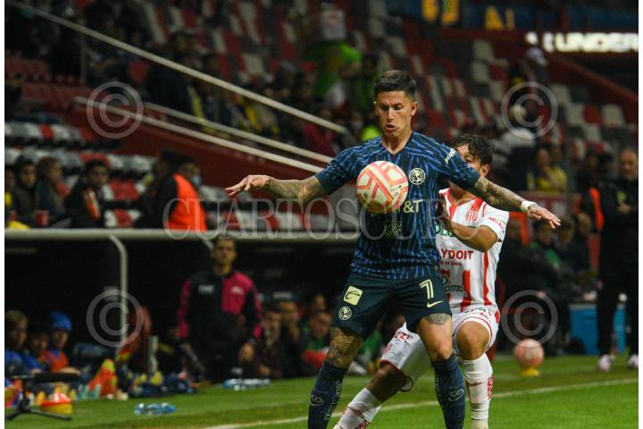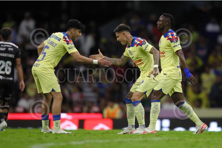 Paul Rodríguez y Kevin Álvarez festejan un gol durante el partido de fútbol América vs Necaxa correspondiente a la jornada 5 del Torneo Apertura 2023 de Liga BBVA MX, en el Estadio Azteca.
