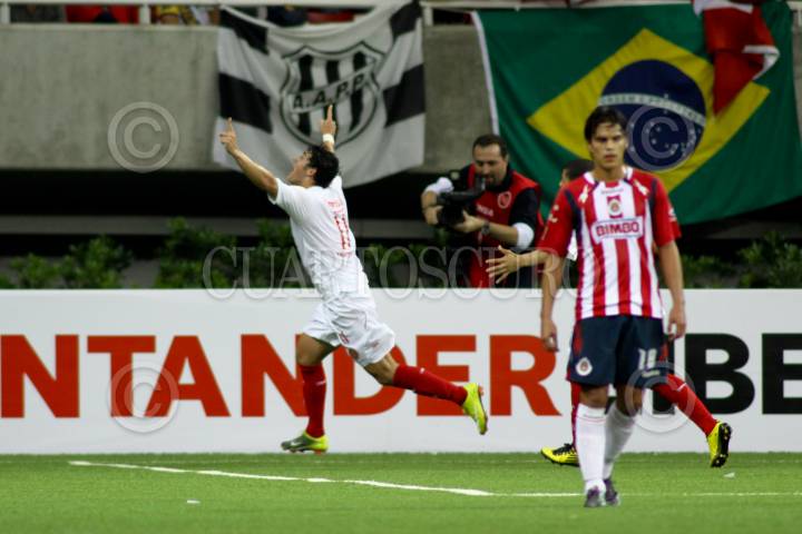 ZAPOPAN, JALISCO, 11AGOSTO2010.- Giuliano Victor de Paula del Internacional de Porto Alegre festeja su anotación durante el encuentro en contra del Chivas del Guadalajara del partido de ida de la final de la copa Santander Libertadores 2010 que se realizo en el estadio Omnilife. El Internacional gano 2 goles por 0 a las Chivas. FOTO: RODOLFO ANGULO/CUARTOSCURO.COM