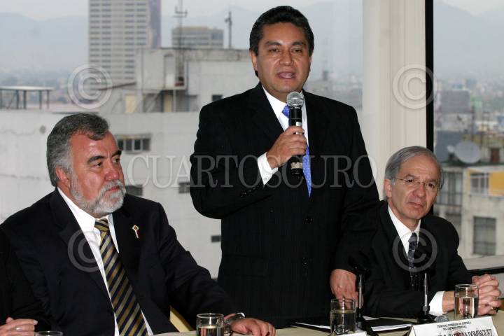 MÉXICO, D.F., 14NOVIEMBRE2006.- Alejandro Encinas, Jefe de Gobierno del DF, José G. Carrera, Presidente del TSJDF y Luis Pazos, titular de Banobras, durante la firma del convenio de colaboración del Plan de Modernización de Justicia del DF, en la sede del Tribunal de Justicia del DF. FOTO: MOISÉS PABLO/CUARTOSCURO.COM