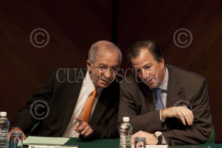 MÉXICO, D.F., 30SEPTIEMBRE2011.- Luis Pazos, Comisión Nacional para la Protección y Defensa de los Usuarios de Servicios Financieros (Condusef), y José Antonio Meade Kuribreña, secretario de Hacienda y Crédito Público, durante la inauguración de la semana nacional "Educación Financiera 2011". FOTO: MOISÉS PABLO/CUARTOSCURO.COM