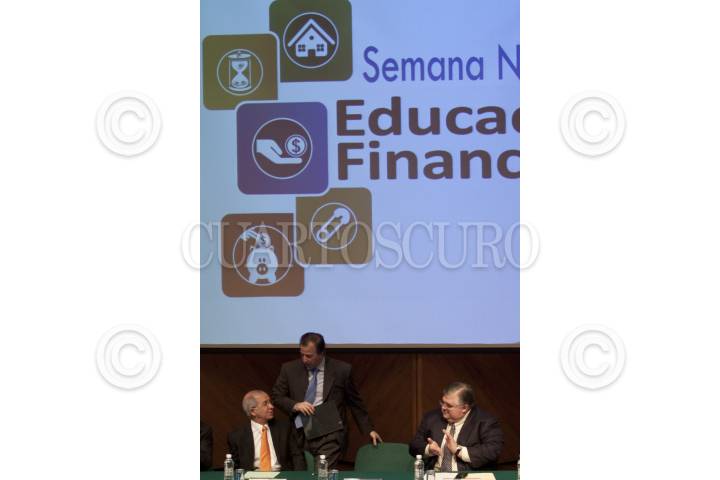MÉXICO, D.F., 30SEPTIEMBRE2011.- Luis Pazos, Comisión Nacional para la Protección y Defensa de los Usuarios de Servicios Financieros (Condusef), José Antonio Meade Kuribreña, secretario de Hacienda y Crédito Público, y Agustín Carstens Carstens, Gobernador del Banco de México, durante la inauguración de la semana nacional "Educación Financiera 2011". FOTO: MOISÉS PABLO/CUARTOSCURO.COM