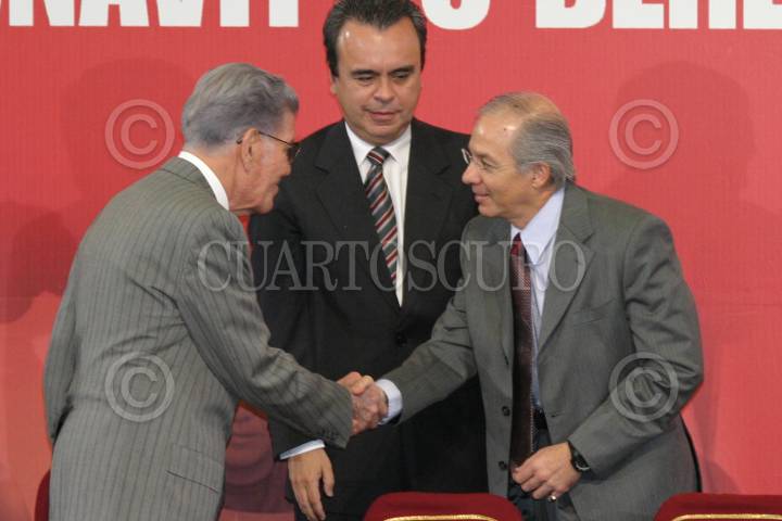 MEXICO, D.F. 20ABRIL2005.- Leonardo Rodríguez Alcaine, liderde la CTM, Manuel Borras Setien, director general del INFONAVIT, y Luis Pazos, se saludan antes de la sesión ordinaria no.87 de la H. Asamblea General del INFONAVIT, encabezada por el presidente Vicente Fox, en el salón Adolfo López Mateos, en Los Pinos. FOTO: Sandra Perdomo/CUARTOSCURO.COM