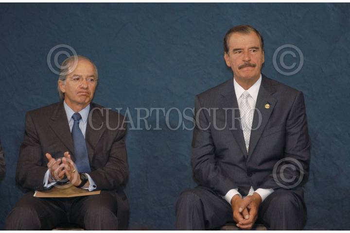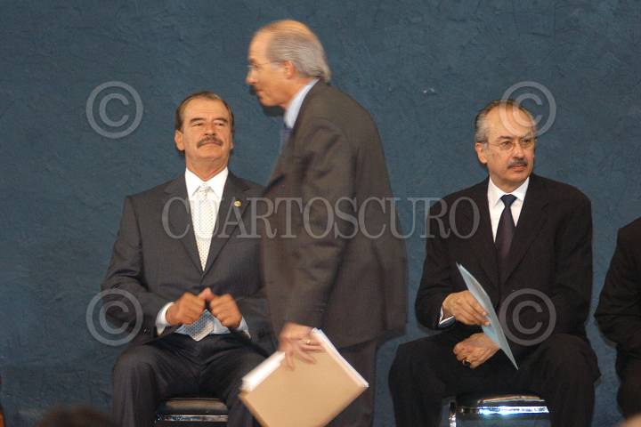 MEXICO D.F. 17MAYO2005.- En la residencia presidencial de Los Pinos, fue presentado el informe de Banco Nacional de Obras y Servicios. El presidente Vicente Fox, Luis Pazos, director de Banobras y Francisco Gil, Secretario de Hacienda durante el evento. FOTO: Germán Romero/CUARTOSCURO.COM