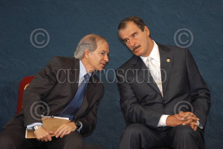 MEXICO D.F. 17MAYO2005.- En la residencia presidencial de Los Pinos, fue presentado el informe de Banco Nacional de Obras y Servicios. Luis Pazos, director de Banobras y el presidente Vicente Fox durante el evento. FOTO: Germán Romero/CUARTOSCURO.COM