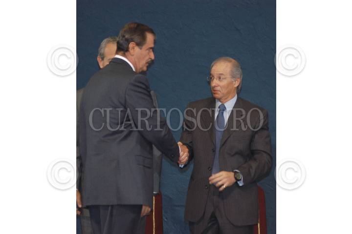 MEXICO D.F. 17MAYO2005.- En la residencia presidencial de Los Pinos, fue presentado el informe de Banco Nacional de Obras y Servicios. El presidente Vicente Fox se despide de Luis Pazos, director de Banobras. FOTO: Germán Romero/CUARTOSCURO.COM