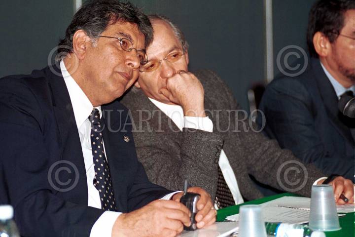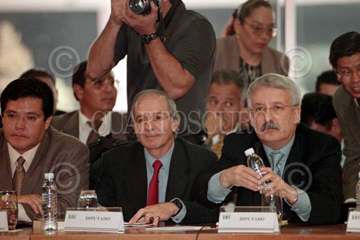 Los diputados Oscar Levín Coppel, presidente de la Comisión de Hacienda y Luis Pazos, presidente de la Comisión de Presupuesto, escuchan el documento que dio lectura el gobernador de Chihuahua, Patricio Martínez, en el cual los mandatarios estatales integrantes de la Conago proponen el monto de la Recaudación Federal Participable y, para 2003, pasar del 20 al 24% que se asigna al fondo general de participaciones, entre otros puntos. FOTO: Oswaldo Ramírez/CUARTOSCURO.COM