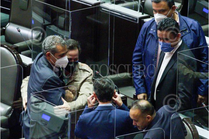 Enrique Ochoa Reza, diputado del PRI, abraza a su compañero de bancada Pedro Pablo Treviño, durante la sesión ordinaria de la Cámara de Diputados.