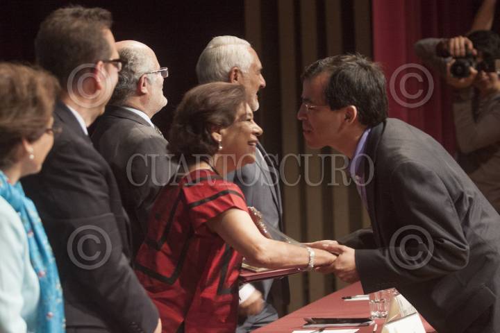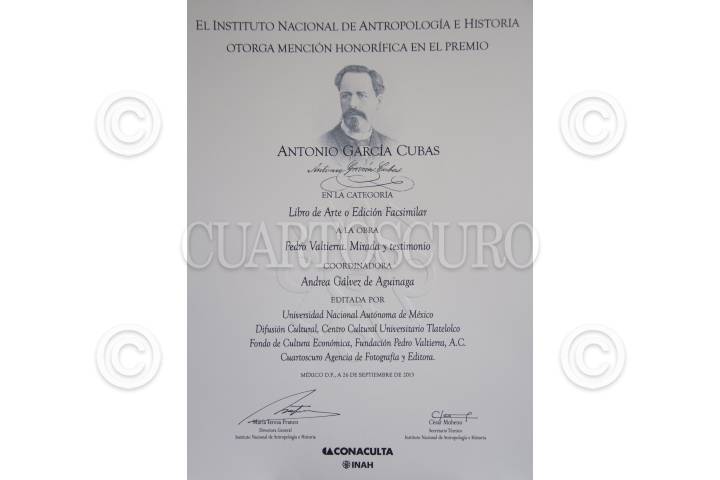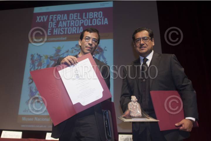 MÉXICO, D.F., 26SEPTIEMBRE2013.- Tomás Granados, en representación del director de Fondo de Cultura Económica (FCE) y Jorge Jiménez Rentería, director del Centro Cultural Tlatelolco, recibieron de manos de María Teresa Franco, directora del Instituto Nacional de Antropología e Historia, una mención honorífica en el premio de Antonio García Cubas en la categoría Libro de Arte o Edición Facsimilar a la obra "Pedro Valtierra. Mirada y Testimonio" editada por UNAM, Centro Cultural Universitario Tlatelolco, Fondo de Cultura Económica, Fundación Pedro Valtierra, A.C. y Cuartoscuro Agencia de Fotografía y Editora, en el marco de la inauguración de la XXV Feria del Libro de Antropología e Historia, que se lleva en el Museo Nacional de Antropología e Historia. FOTO: MOISÉS PABLO /CUARTOSCURO.COM