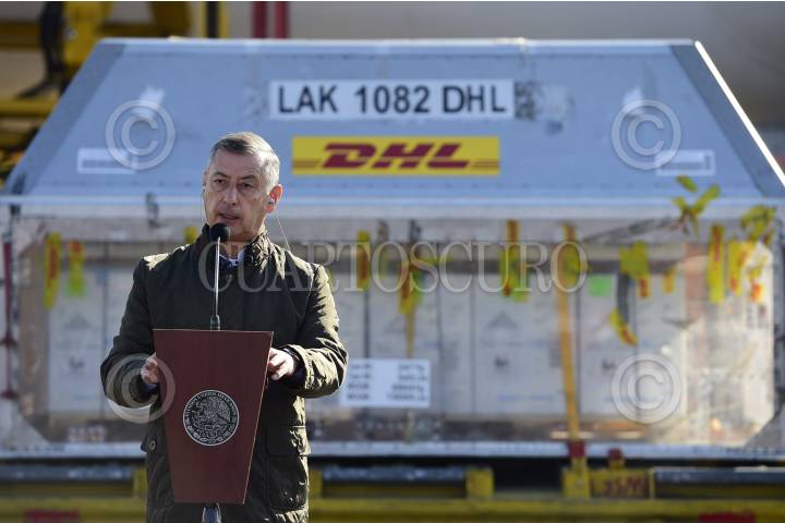 Pedro Zenteno, director de Birmex, presidió la recepción de vacunas contra covid-19, en el Aeropuerto Internacional de la Ciudad de México.
