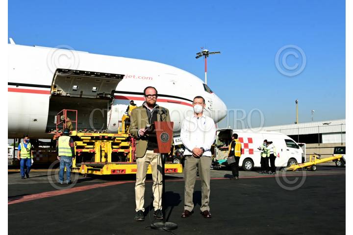 Ruy López Ridaura, director General del Centro Nacional de Programas Preventivos y Control de Enfermedades y Pedro Zenteno, director de Birmex encabezaron la recepción de vacunas contra Covid-19 en el AICM