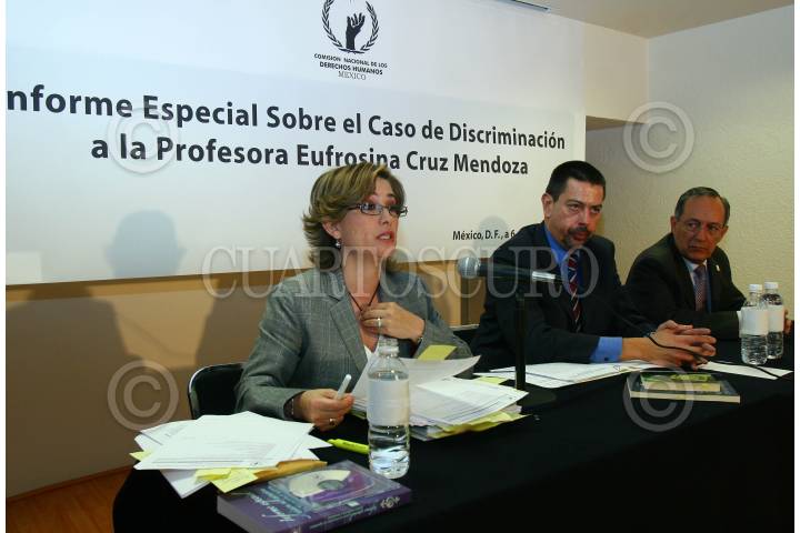 MEXICO, D.F., 06MARZO2008.- Susana Talia Pedroza, Segunda Visitadora del CNDH y encargada del Programa de Igualdad entre Hombres y Mujeres, Mauricio Ibarra, 4 visitador de la CNDH y Pedro Camacho Marín, director de Comunicación CNDH, durante el informe especial sobre el caso de Discriminación a la Profesora Eufrosina Cruz Mendoza. FOTO: MOISÉS PABLO/CUARTOSCURO.COM