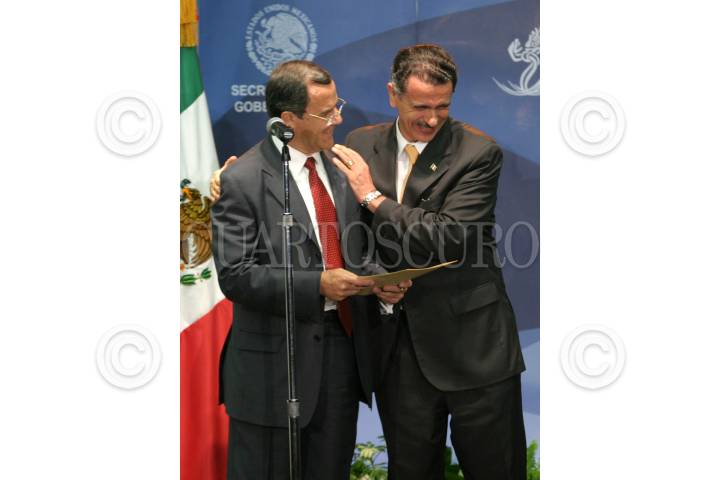 MEXICO, D.F. 20JUNIO2005.- Enrique Aranda Pedroza, recibe una felicitación de parte de Carlos Abascal, secretario de gobernación, al termino de su nombramiento como subsecretario de normatividad de medios en gobernación. FOTO: Nelly Salas/CUARTOSCURO.COM