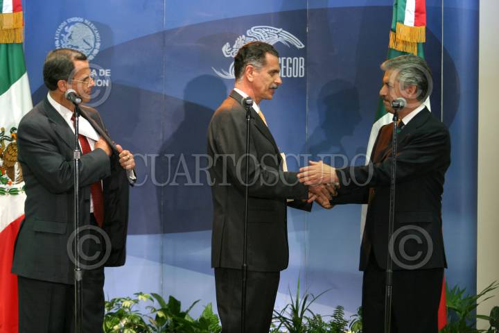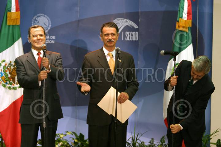 MEXICO, D.F. 20JUNIO2005.- Enrique Aranda Pedroza, observa a Carlos Abascal, secretario de gobernación y a Ricardo García Cervantes, quien dejó el cargo de subsecretario de normatividad de medios en gobernación. FOTO: Nelly Salas/CUARTOSCURO.COM