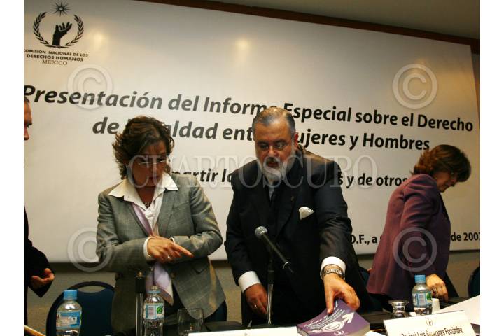 MÉXICO, D.F. 06DICIEMBRE2007.- El titular de la Comisión Naconal de Derechos Humanos, José Luis Soberanes ofreció su informe sobre el derecho de igualdad entre mujeres y hombres. En la imagen con Susana Pedroza, segunda visitadora de la CNDH y Margarita Velazquez, director general del programa de igualdad entre hombres y mujeres. FOTO: PAOLA HIDALGO/CUARTOSCURO.COM