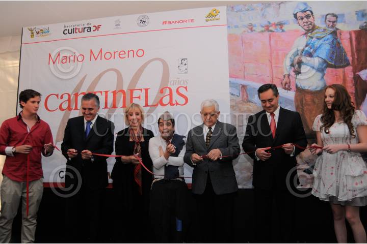 MÉXICO,D.F.,25JULIO2011.- Mario Moreno III, nieto de "Cantinflas", Raul Pelaez Cano de grupo Banorte, Mati Guitron, Directora Vitalicia de la Casa del Actor, el actor Carlos Espejel, Eduardo Moreno Laparade, Carlos Eduardo Martines de grupo GRUMA y Valentina Moreno del Moral inauguraron la exposición de Mario Moreno "Cantinflas" 100 años que la Fundación Mario Moreno IAP y la inversión privada organizaron. FOTO:FRANCISCO RODRÍGUEZ/CUARTOSCURO.COM